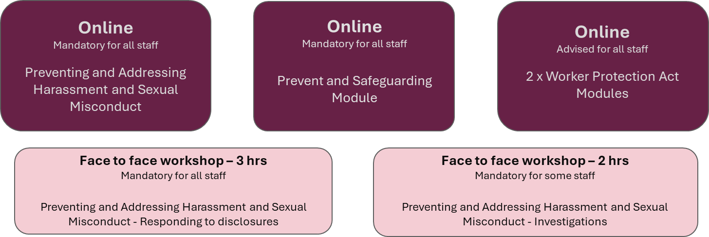 All staff must complete mandatory Preventing and Addressing Harassment and Sexual Misconduct training, tailored to their role. Face to face training is phased, based on need, and line managers will inform staff of their training requirements and how to join workshops.